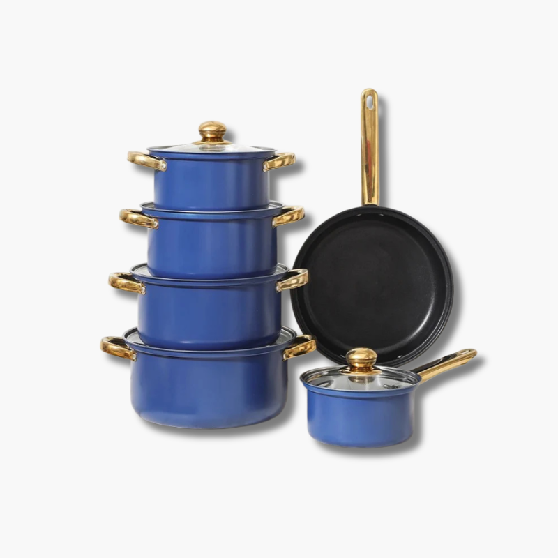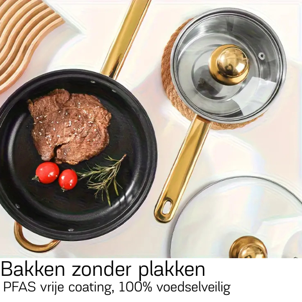 Genau hier zeigt sich das 12-teilige Leckora-Pfannenset von seiner besten Seite. Ein Set, das nicht nur alles bietet, was du brauchst, um deine Kochskills auf das nächste Level zu bringen, sondern das auch richtig was hermacht. Hochwertiger Edelstahl mit glänzender Oberfläche, elegante goldene Griffe für einen Hauch von Luxus und genügend Auswahl, um jedes Gericht ohne Stress zuzubereiten.