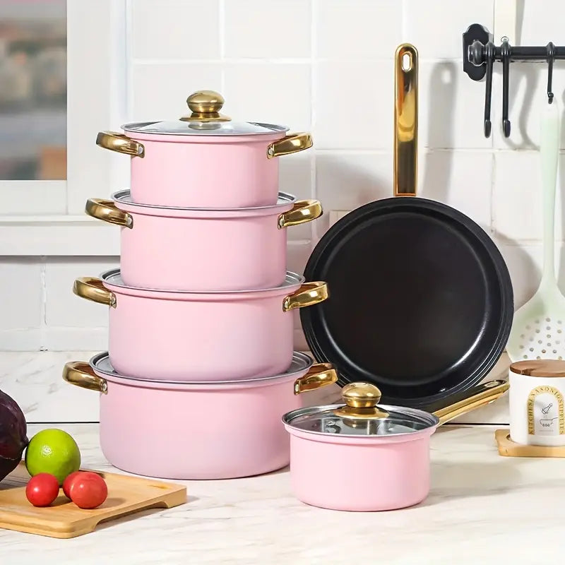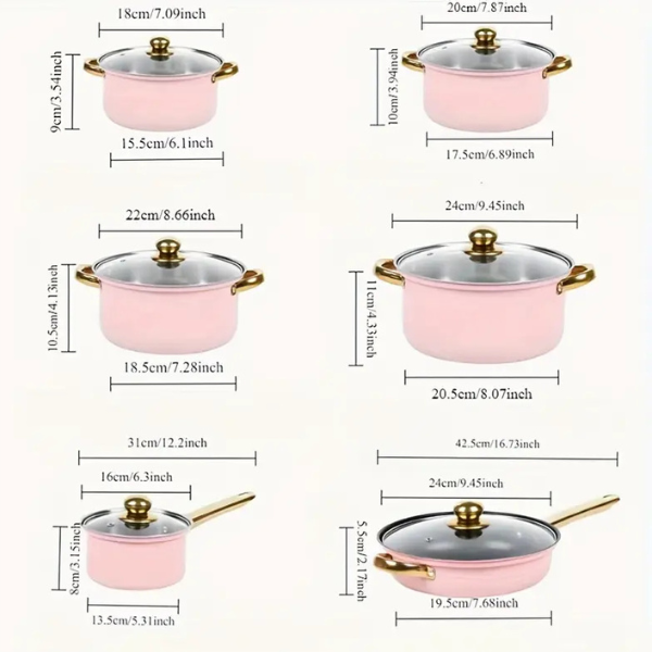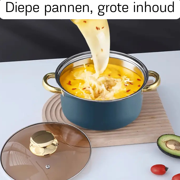 ✓ Goldene Griffe, die nicht nur edel aussehen, sondern angenehm in der Hand liegen. ✓ Pfannen, die wirklich alles können: Gas, Induktion, Elektro – keine Ausreden mehr. ✓ Edelstahl, der sich nicht verzieht oder rostet → dein Set bleibt jahrelang wie neu. ✓ Kinderleichte Reinigung: spülmaschinenfest und spiegelglatt ✓ Vom Erhitzen von Milch bis zum Eintopf für die ganze Familie – alles ist im Set enthalten.