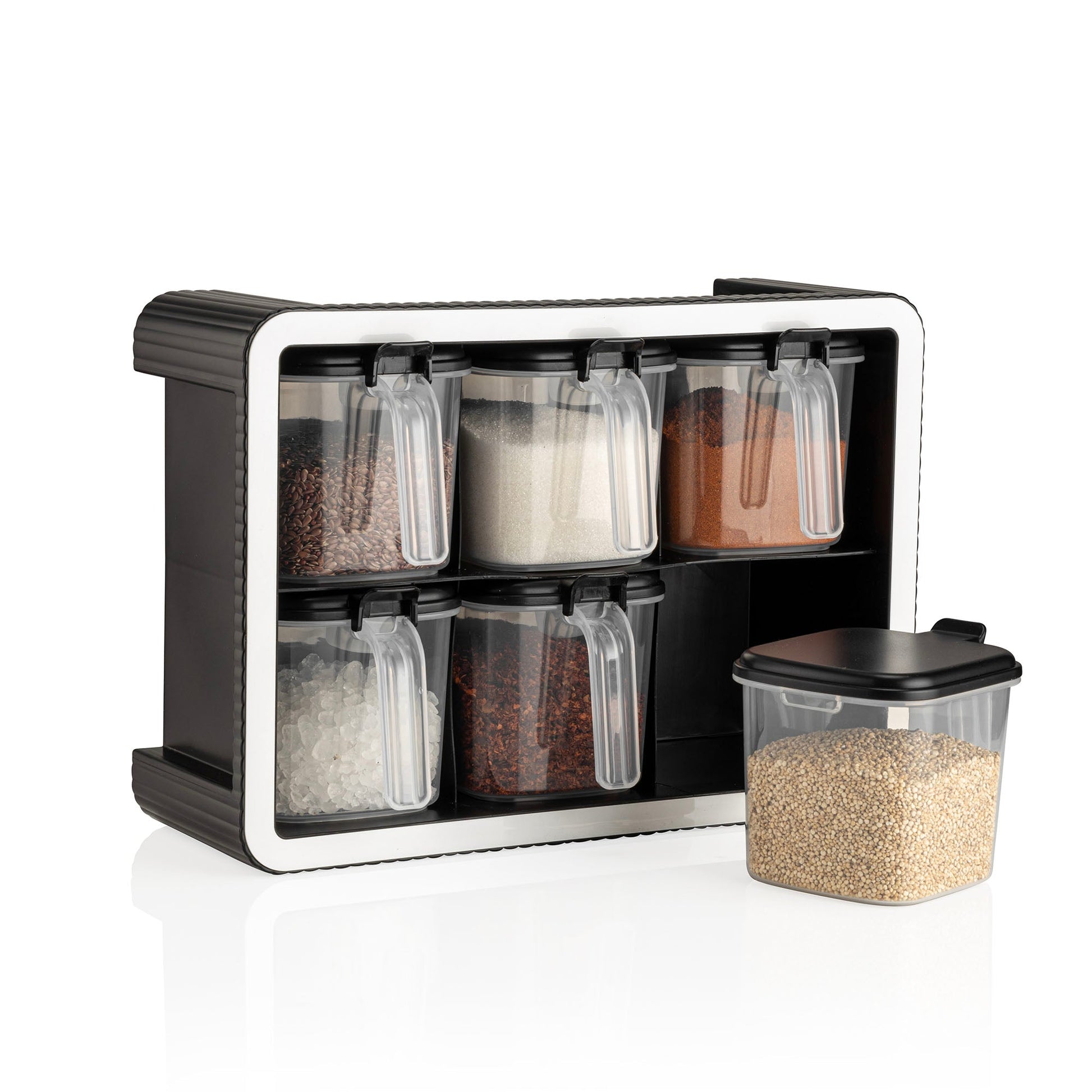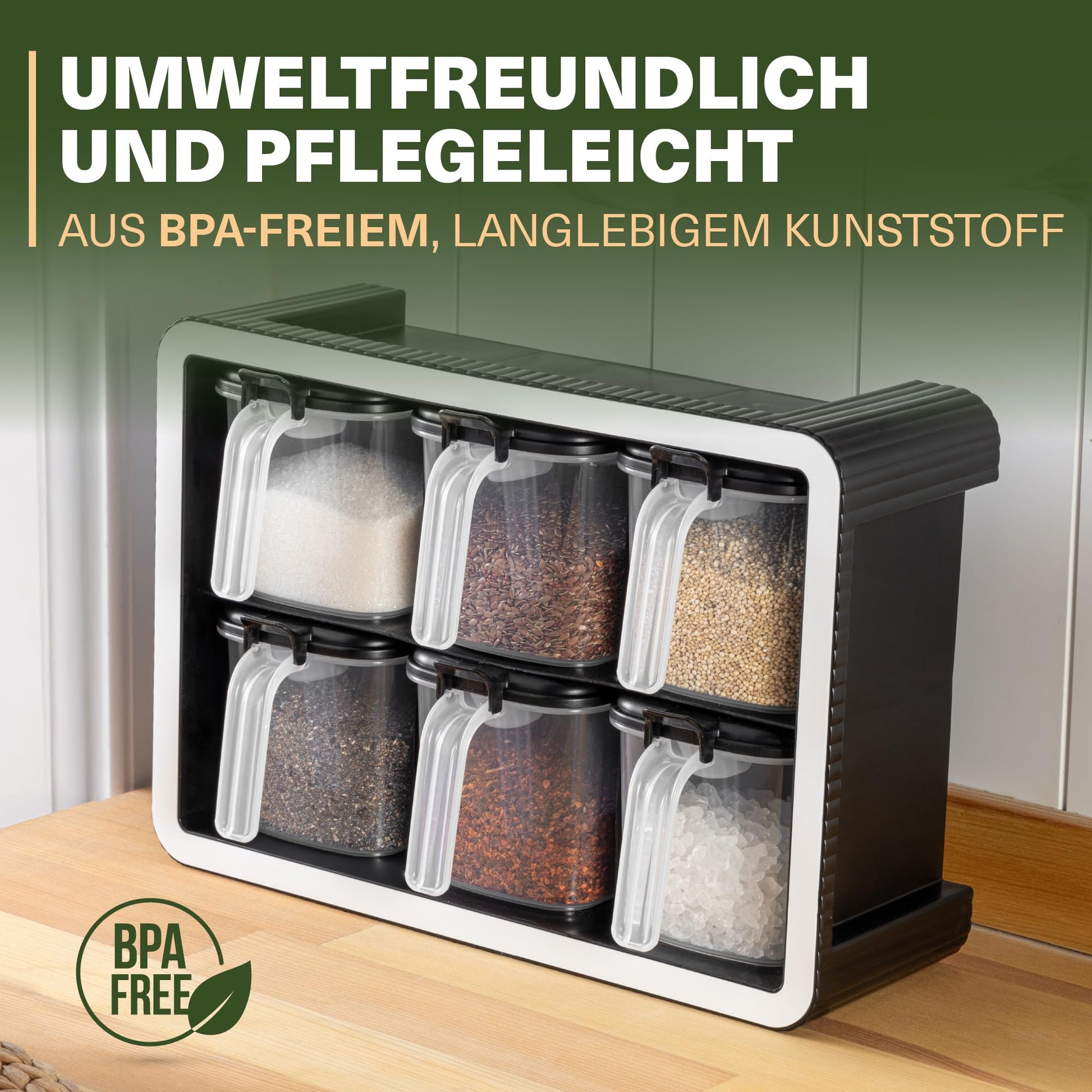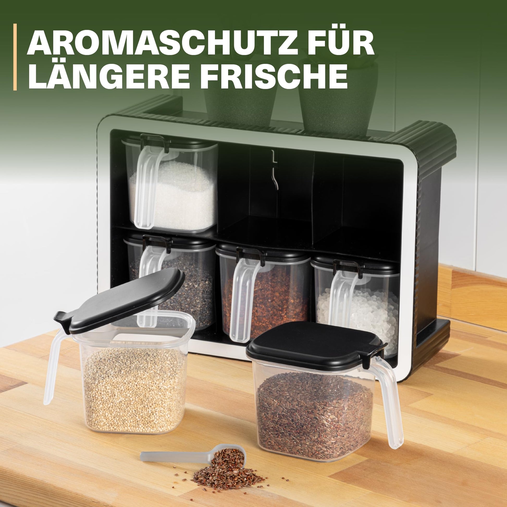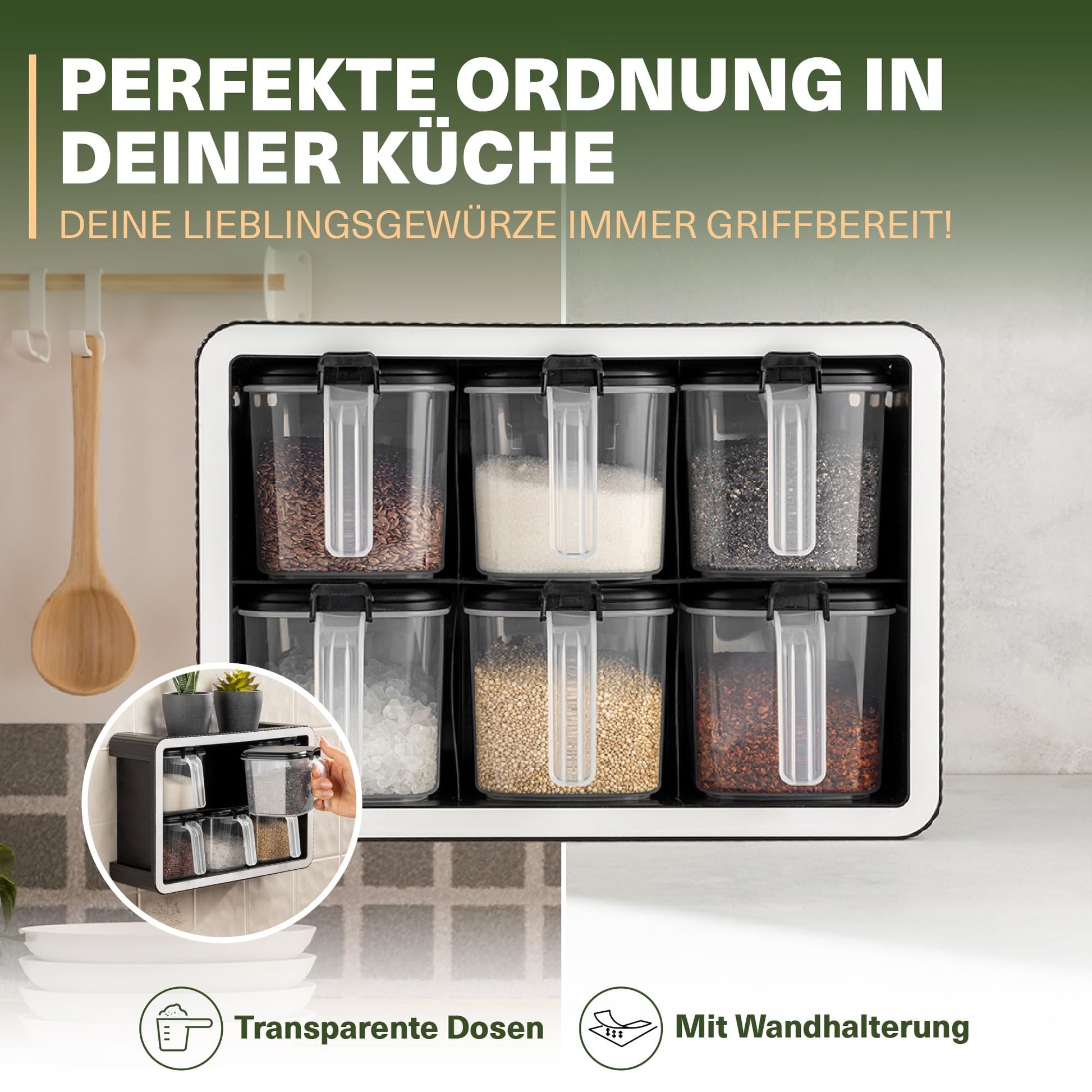 Unsere Gewürzdosen-Sets mit Wandhalterung und integrierten Dosierlöffeln bringen frische Ordnung in deine Küche. Dieses elegante Set bietet die ideale Lösung, um deine Gewürze sauber und übersichtlich zu verstauen. Dank der transparenten Behälter erkennst du auf einen Blick, welches Gewürz du benötigst. Die luftdichten Deckel halten Aromen und Frische zuverlässig eingeschlossen, sodass deine Kräuter und Gewürze ihre volle Intensität behalten.